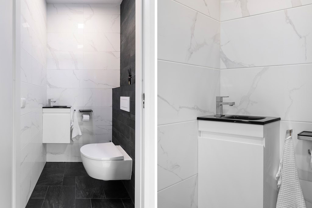 Via de beschutte voortuin met ruime oprit betreed je de woning. De hal is uitnodigend en ruim, met garderobe, meterkast en een modern toilet met fonteintje.